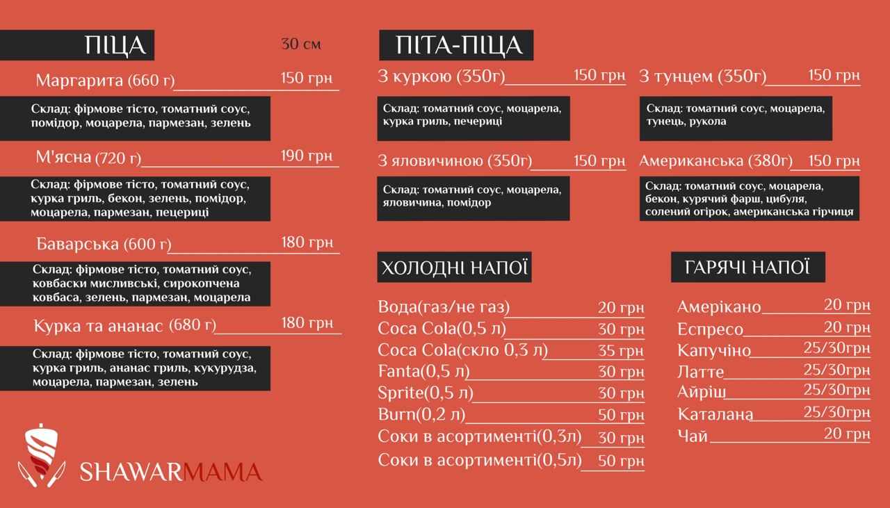 «Шавар мама» не обмежується лише шаурмою. У цьому закладі вас приємно здивують бургери, піца, чебуреки, хот-доги та салати. Якщо ви не можете визначитися, що саме хочете сьогодні, то тут є великий вибір, який задовольнить будь-який смак.